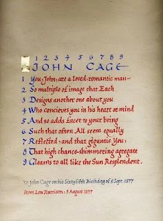 Lou Harrison and John Cage were very good friends for a very long time. This is a little-known item held in the archives of the John Cage Trust, framed and hung very near to Laura Kuhn's hideously cluttered desk.